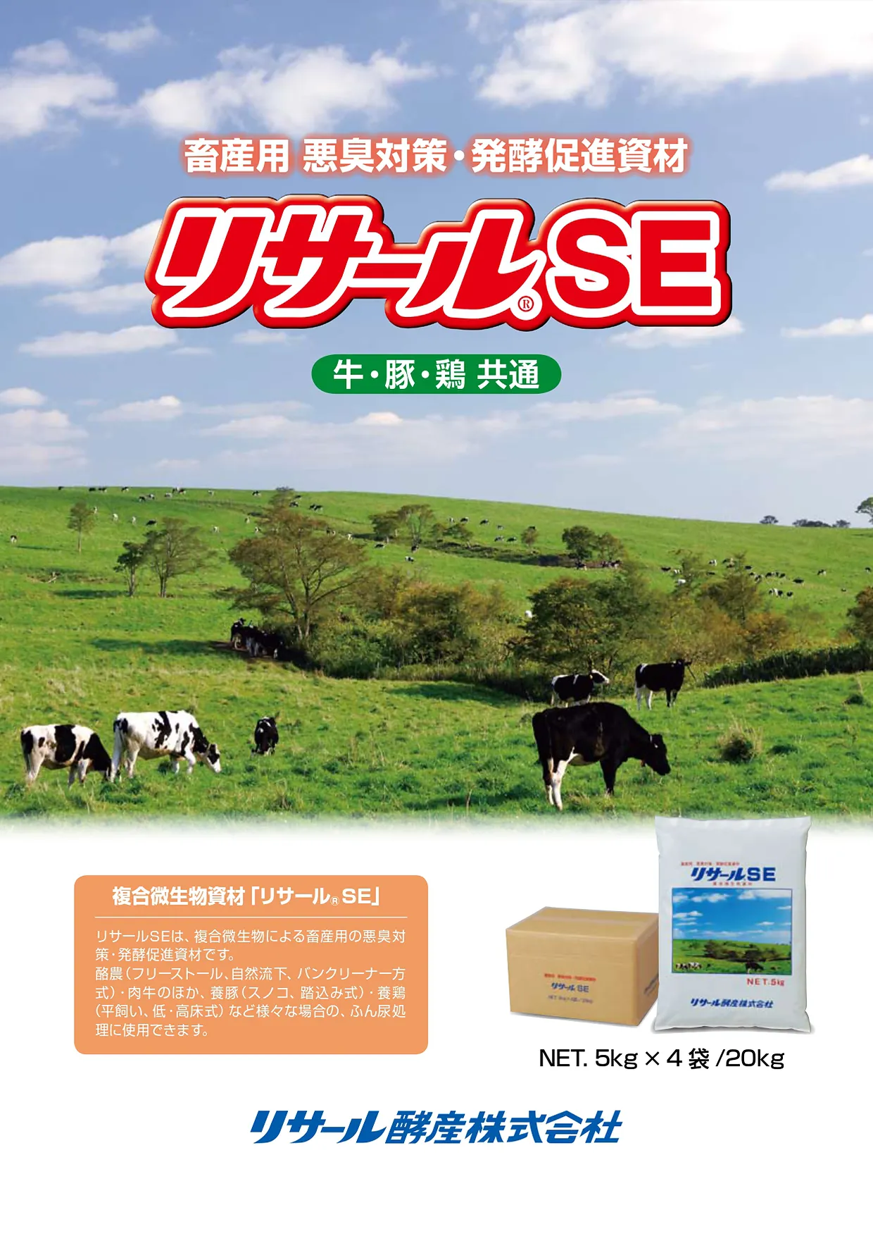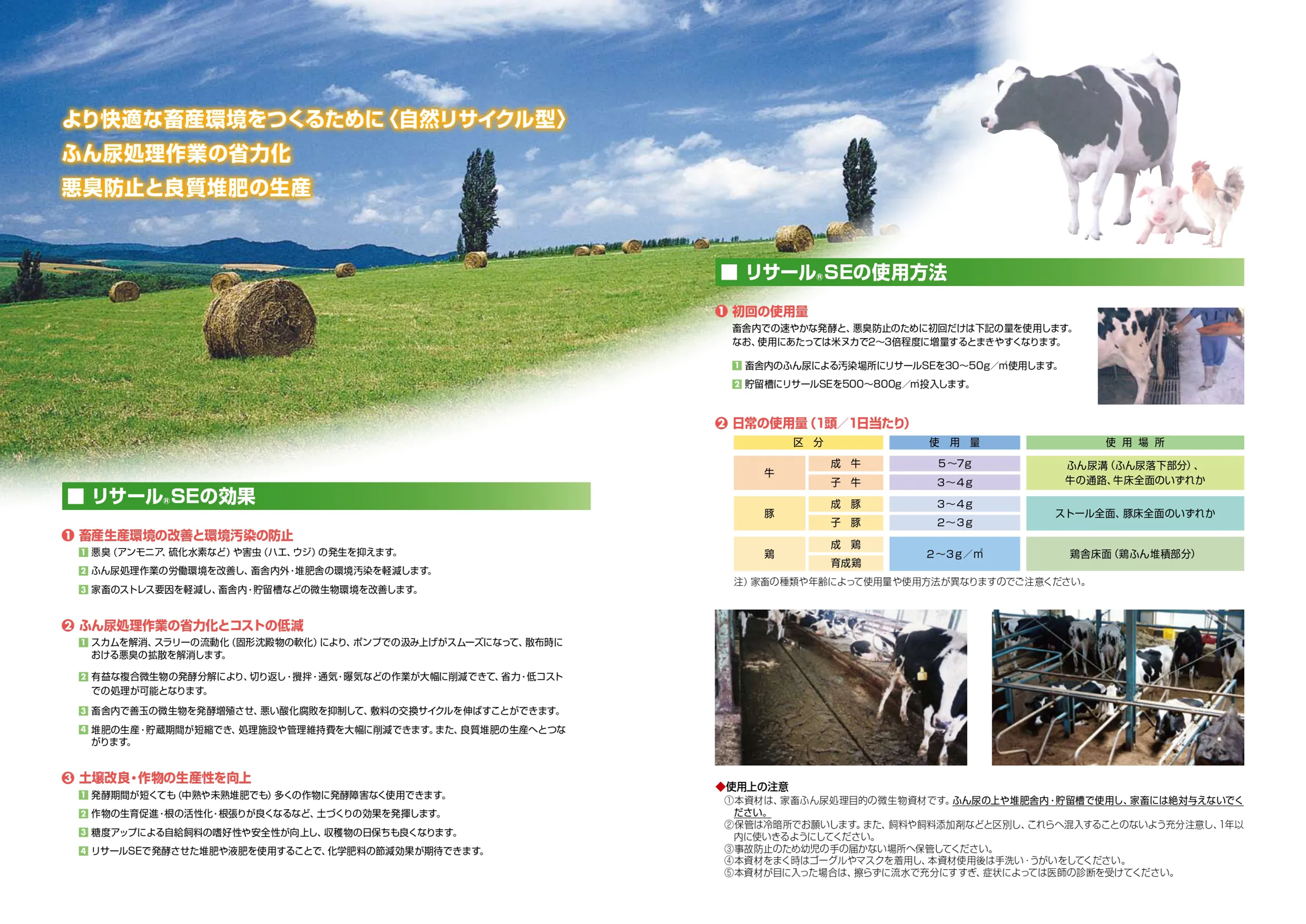 リサールSEは、複合微生物による畜産用の悪臭対策・発酵促進資材です。酪農(フリーストール、自然流下、バンクリーナー方式)・肉牛のほか、養豚(スノコ、踏込み式)・養鶏(平飼い、低・高床式)など様々な場合の、ふん尿処理に使用できます。