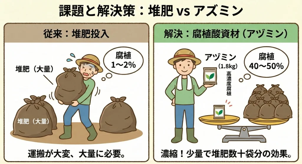 そこで登場するのが腐植酸資材なんだよ。これは堆肥の中で有効成分だけをギュッと濃縮したようなもの。堆肥を100袋入れたのと同じくらいの腐植を、ほんの数kgで補えるんだよ。