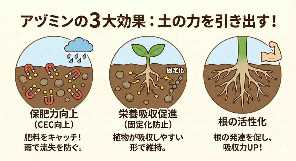 まず1つ目は、今回のテーマでもあるCECを大幅に高めてくれるんだよ。つまり保肥力をアップしてくれるということ。そうすると肥料の持ちが良くなって、栄養が雨で流れにくくなるんだよね。