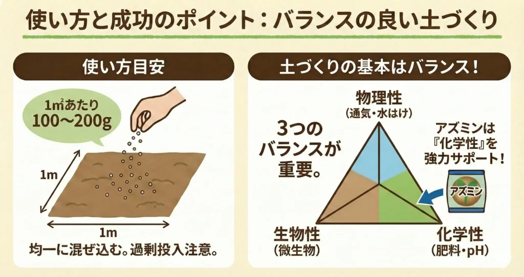 アヅミンは濃縮された腐植酸資材だから、ドカッと入れすぎる必要はない。目安としては1㎡に100g〜200gぐらい、薄く均一にまいて耕すぐらいで十分だよ。