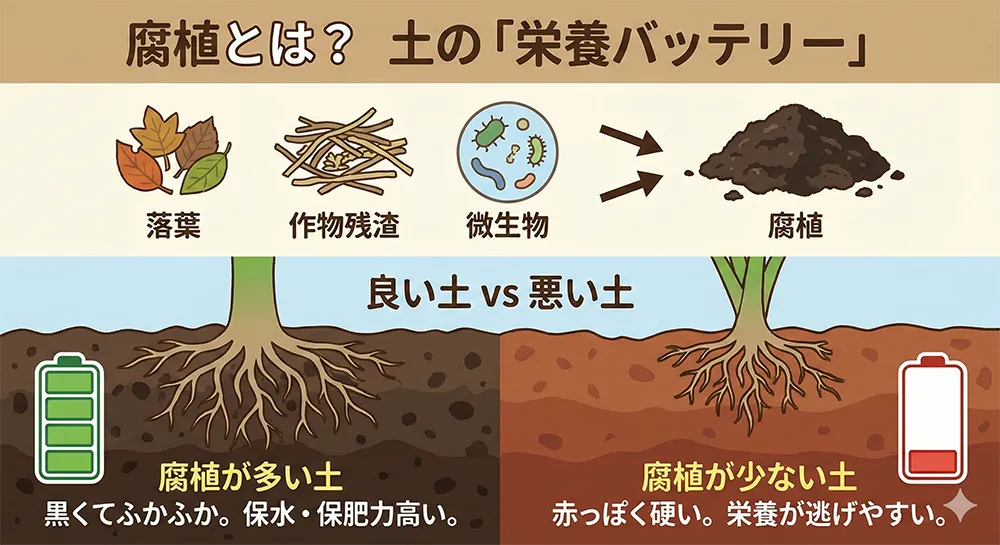 腐植は、スポンジみたいに栄養や水分を溜め込む力もあるし、保肥力(肥料の持ち)を良くしてくれるんだよ。植物が必要な時にはそれを少しずつ放出してくれる。腐植が多い土ほど肥料の持ちがいいというわけ。