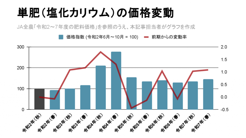 令和5年度には一時的に値下がりが見られましたが、その後ふたたび上昇傾向に転じ、結果として令和2年度の水準を下回った時期は一度もありません。肥料価格は安くなるどころか、「高い状態が当たり前」という新しい価値観に切り替わりつつあるのです。