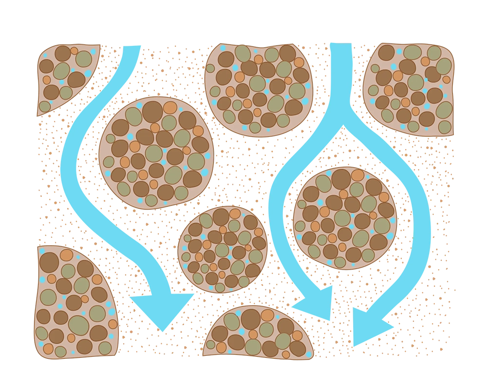 団粒構造 | 土の微小な粒子が有機物や微生物のはたらきで小さな“かたまり(団粒)”になった状態です。水はけと水もち、通気性を同時に満たす理想形で、根が酸素と水・養分をバランスよく得られます。 |