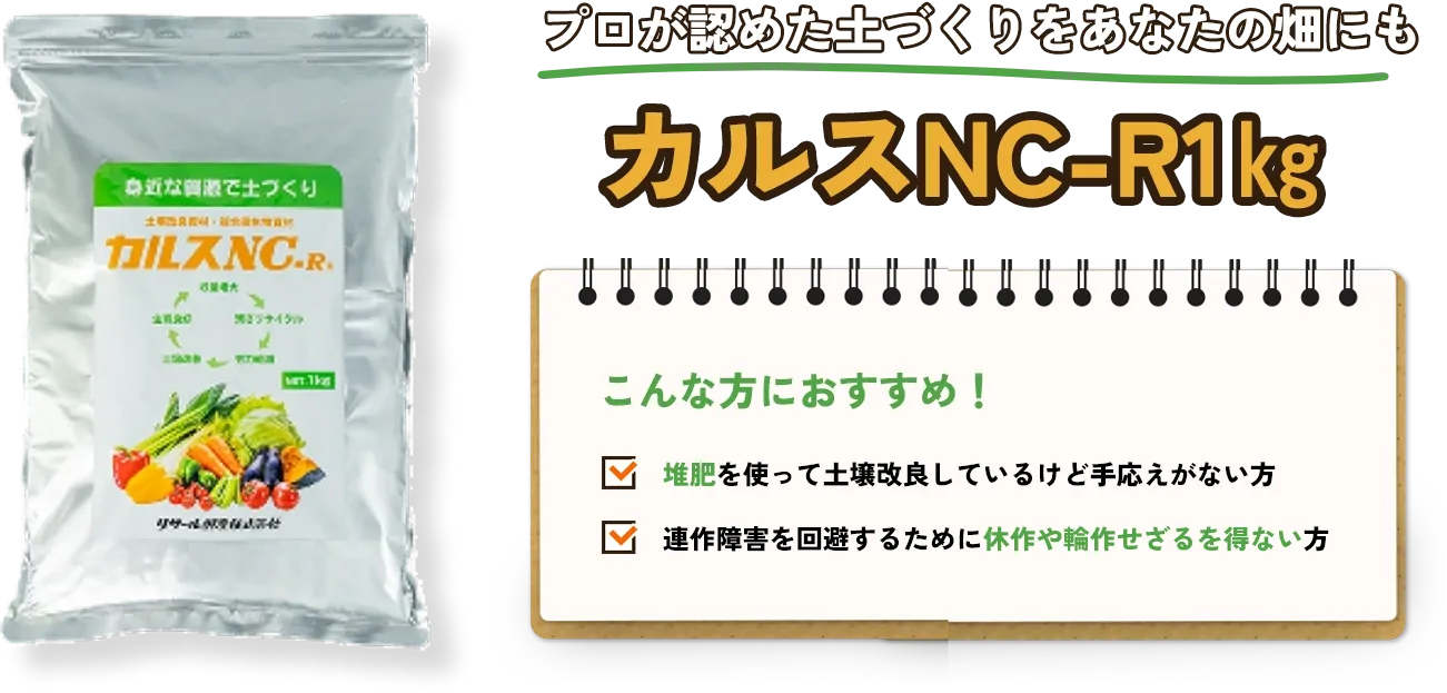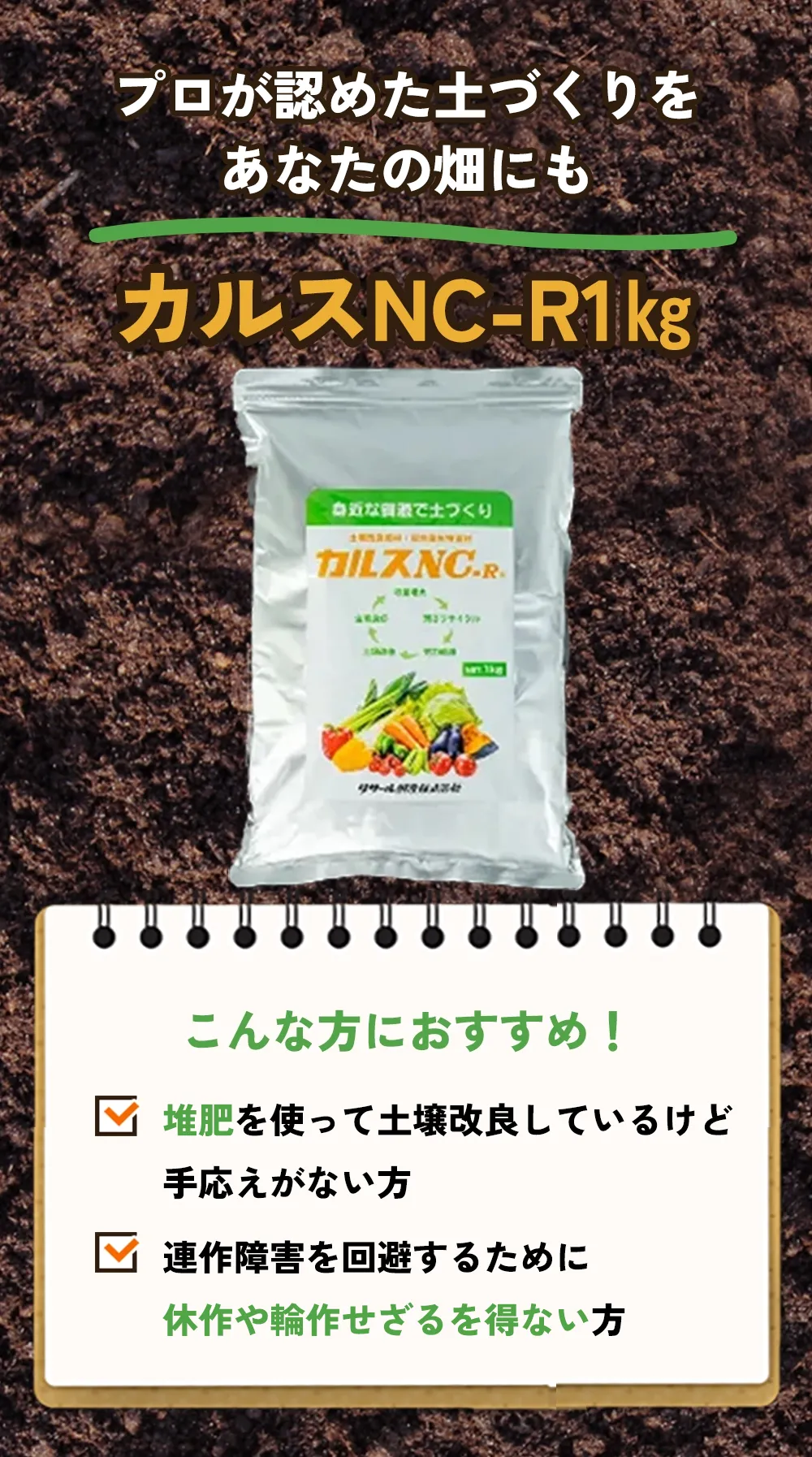 | 超カルスNC-Rとの違い | 従来のカルスNC-Rを進化させた家庭園芸向け商品。米ぬか不要で使いやすく、手軽に土壌改良が可能です。 |