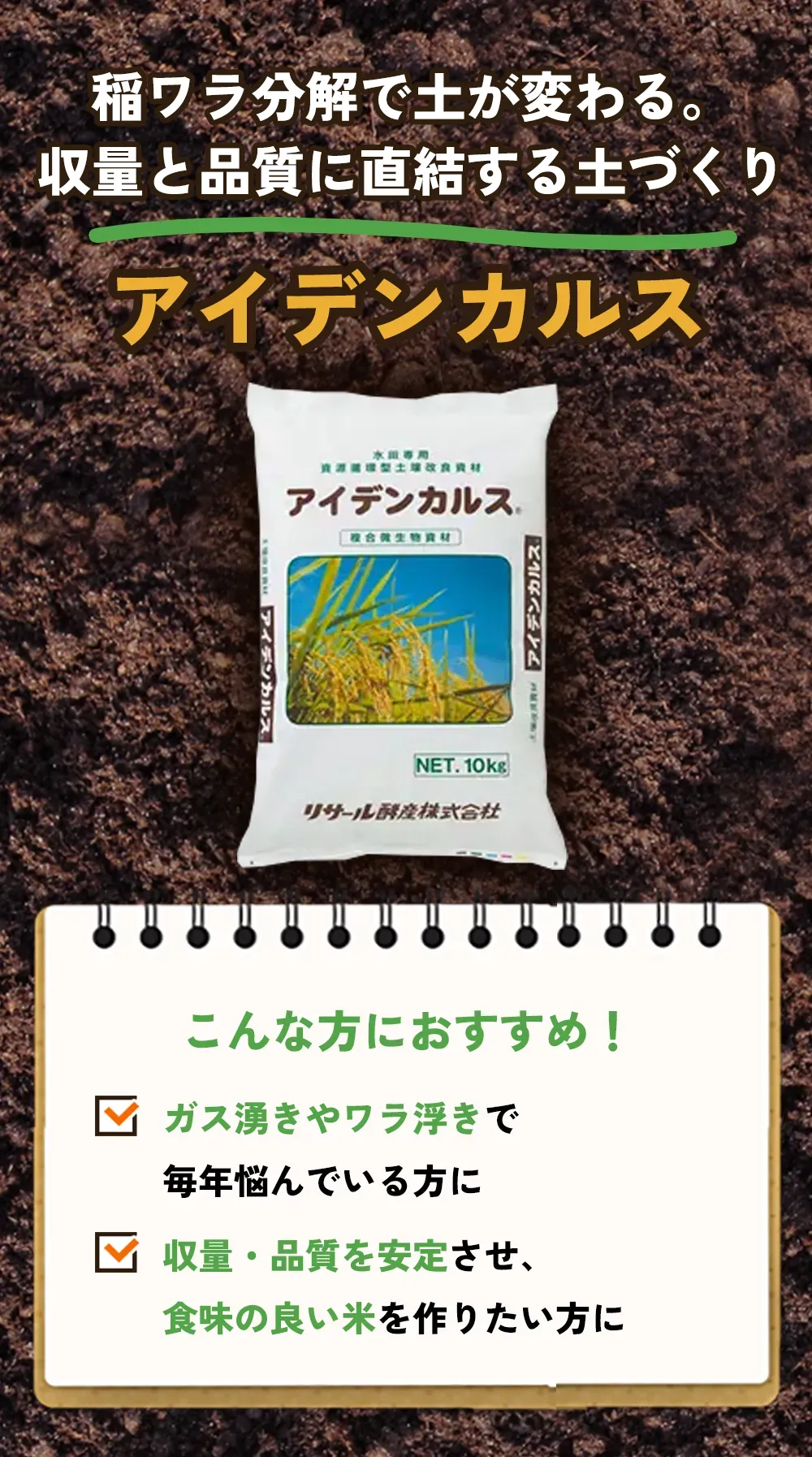 なお、二毛作の麦あと水稲栽培には、粉状の姉妹品「アイデンカルス」をご使用ください。